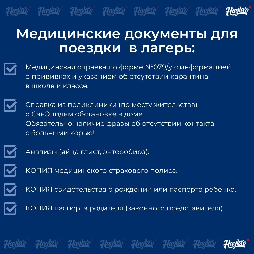 Начнем со списка медицинских документов, необходимых для поездки и правил их оформления • Медицинская справка по форме N°079/у. (берется в медпункте школы или в поликлинике у терапевта). В справке должна быть указана следующая информация о ребёнке: санэпидокружение в школе (в классе), показания для пребывания в лагере, перенесённых заболеваниях, диспансерный учет, прививки по возрасту (RV кори, свежая реакция манту (действ. 1 год), АДСМ, гепатит Б), хронические заболевания. • Справка из поликлиники (по месту жительства) о СанЭпидем обстановке в доме. Берётся в поликлинике по месту жительства или в СЭС в последний рабочий день поликлинники перед отъездом на смену ( не более 72 часов). В справке указывается информация об отсутствии контактов карантинными заболеваниями, отсутствии кожных заболеваний и педикулеза. Обязательно наличие фразы об отсутствии контакта с больными корью! • Анализы: яйца глист, энтеробиоз. Срок действия — 1 месяц. • КОПИЯ медицинского страхового полиса (с 2 сторон). Копия должна быть хорошо читаема. Не требует нотариального заверения. • КОПИЯ свидетельства о рождении или паспорта ребенка. • КОПИЯ паспорта родителя (законного представителя). ![]() |