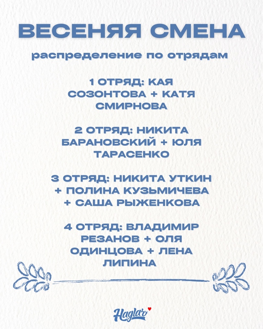 До Весенней смены всего 5️⃣ дней! Представляем распределение вожатых на Весенней смене’25. С нетерпением ждём встречи с вами 💙 |